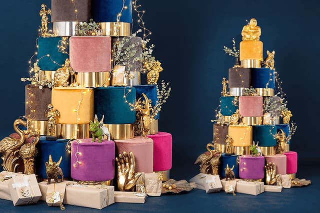 Delicious, pop-in-your-mouth cookies and sweets require a central location, like an ottoman where guests can move around and see the whole selection. Add glass or crystal jars filled with gold balls or battery-operated strings of lights. It’s a simple trick to set it out on a mirrored tray (or a flat mirror) to reflect the light and add sparkle.