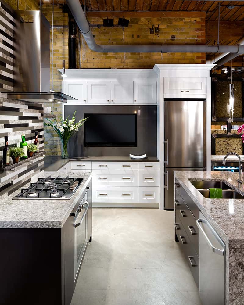 - A full 42" television is mounted within a quartz surround and positioned above the counter top. This treatment shows homeowners they can have a TV within their kitchen that blends in seamlessly.