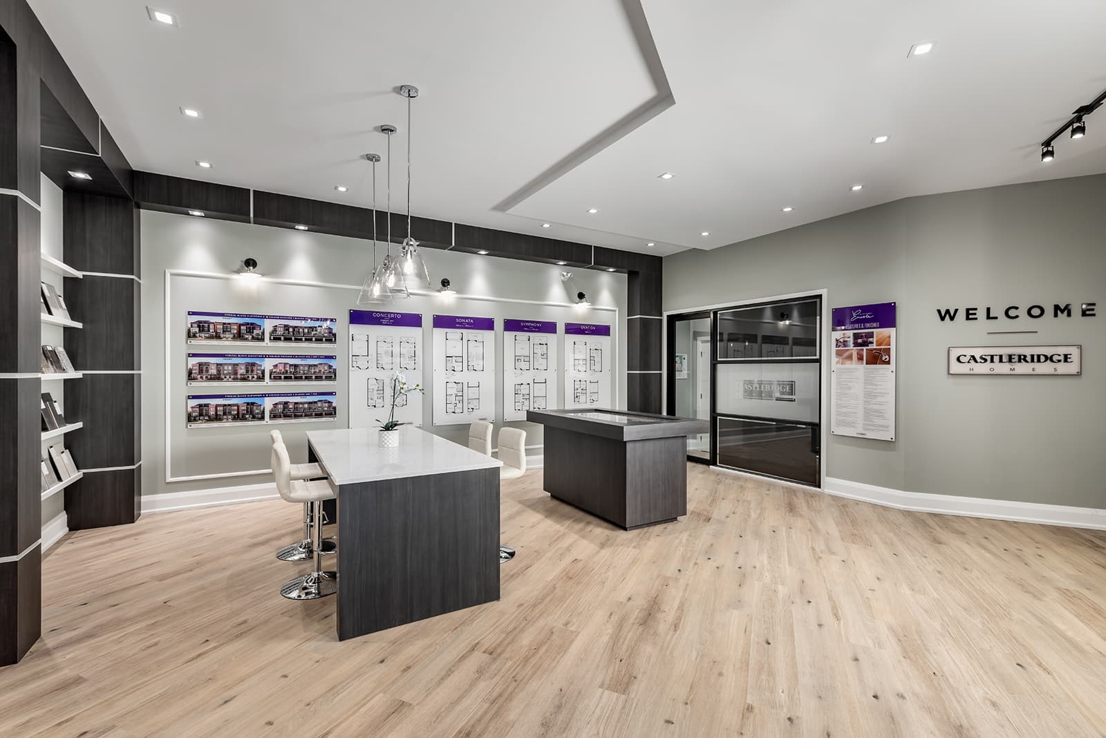 We designed four of the six sales suites on behalf of Castleridge Homes, Lindvest, Primont Homes, and Hallett Homes. Each client had exacting demands for their suites, all of which our team was able to complete.