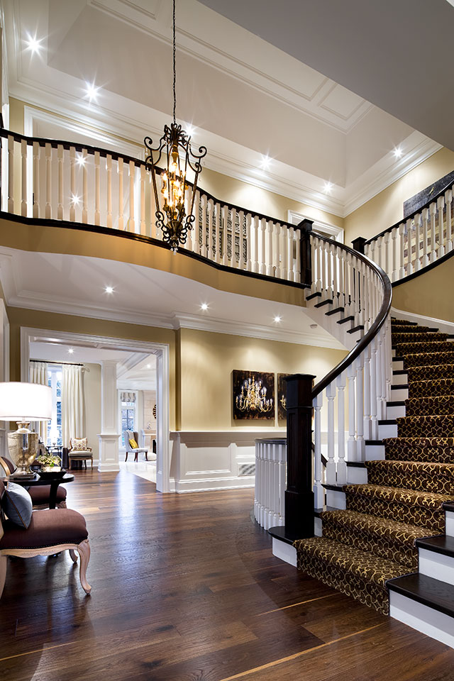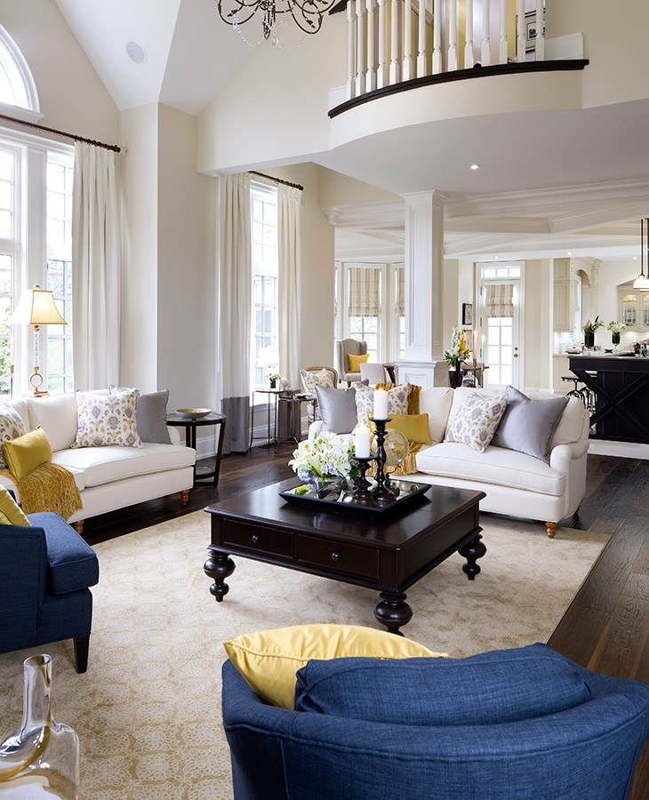 It’s hard to imagine that a 5,600 square foot home could be relaxed, comfortable and welcoming but this custom home does just that. With a warm palette of taupe, cream, navy, brown and shots of mustard, this home is not only spacious it radiates style in every direction.