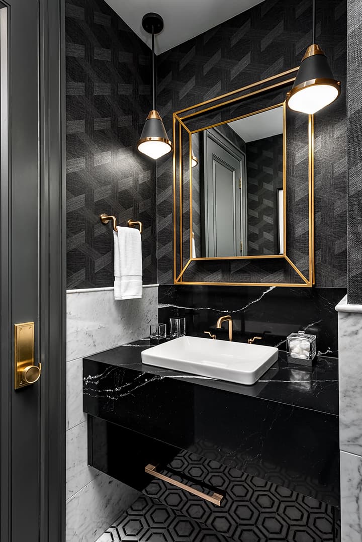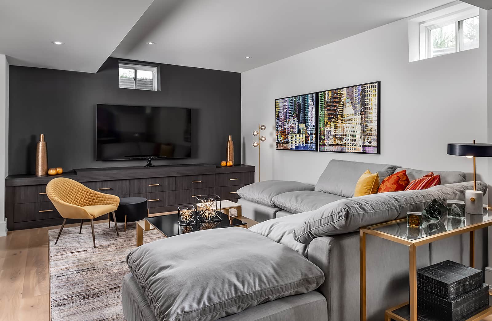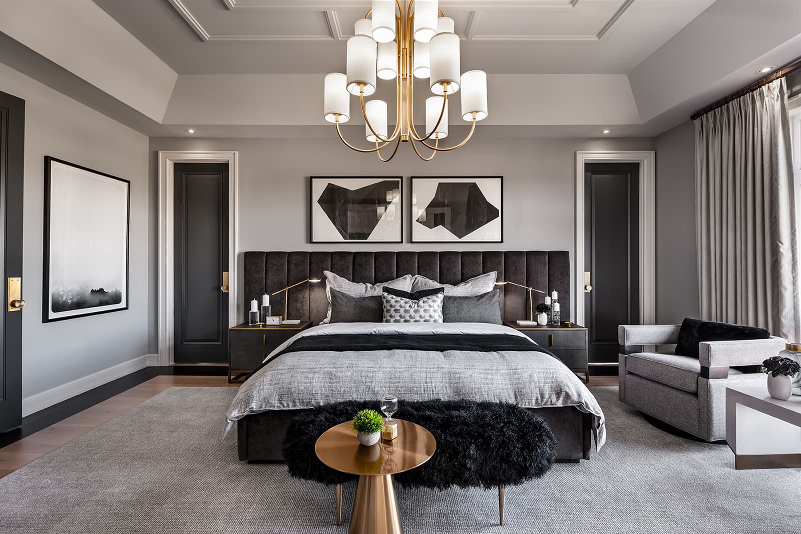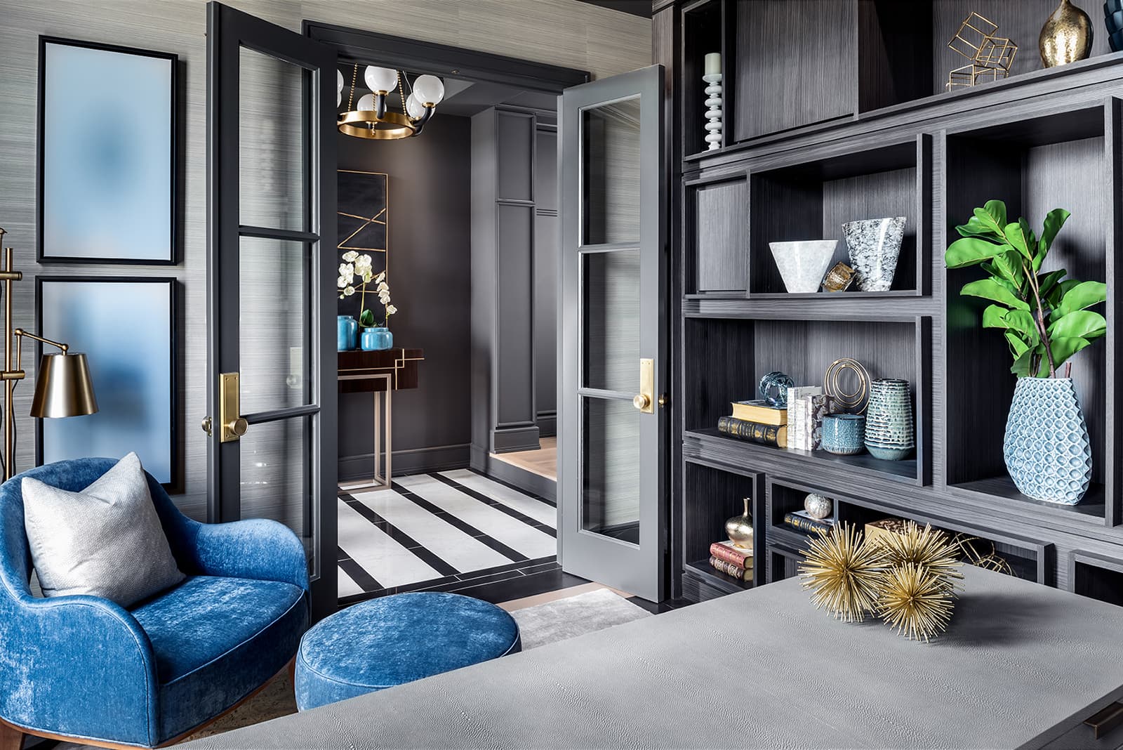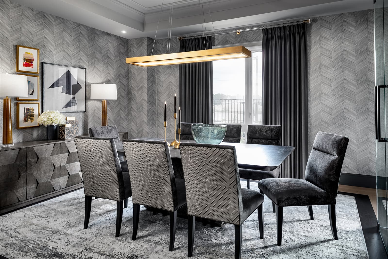 We wanted to create drama and intrigue but still keep the home feeling cozy and easy to live-in. Choosing a palette of smokey greys and gold accents in a variety of textures, sheens and patterns helped us achieve the modern, sophisticated look we were going for.