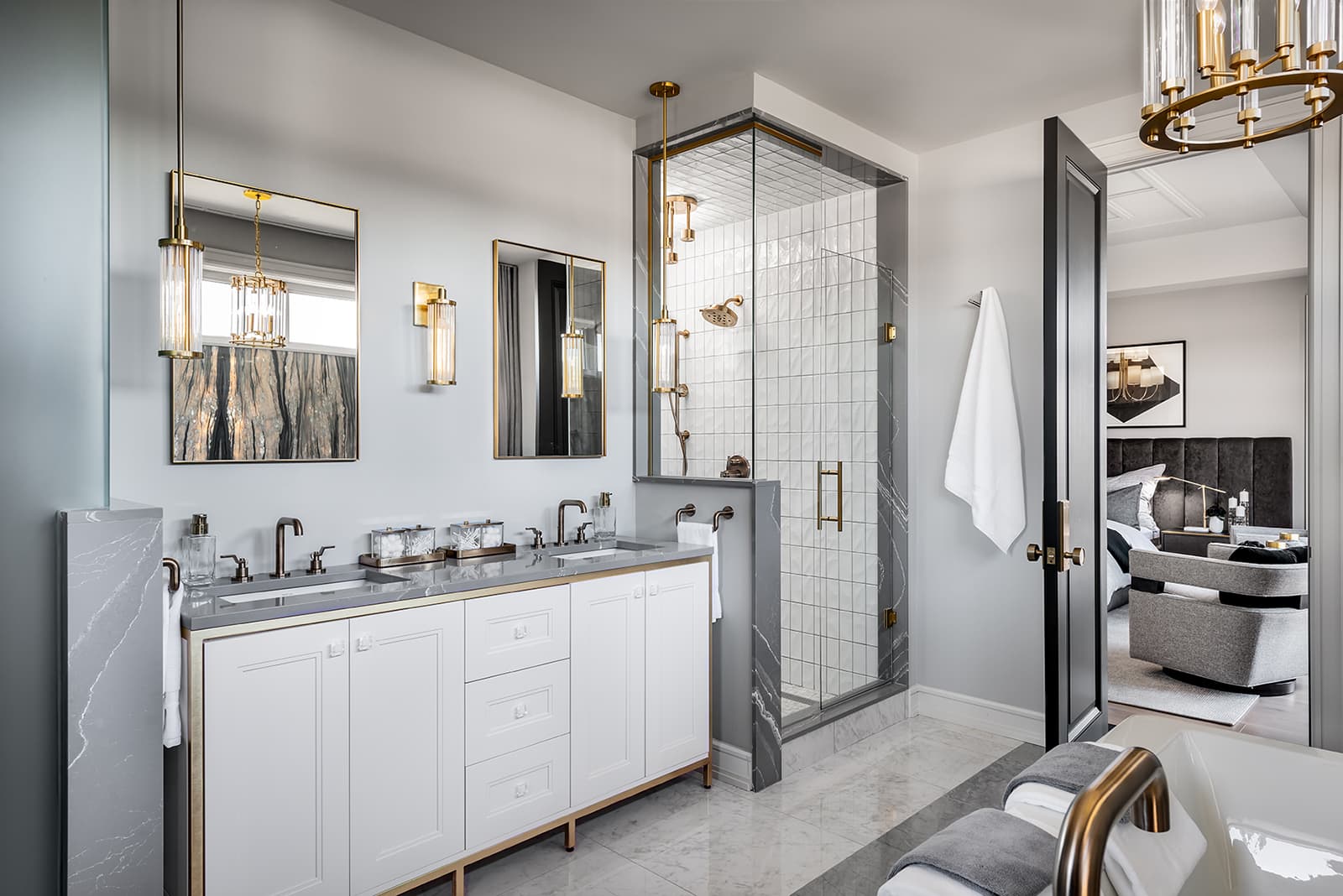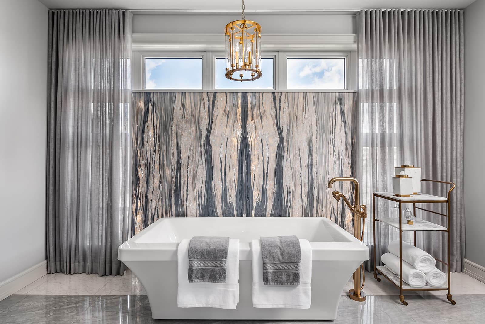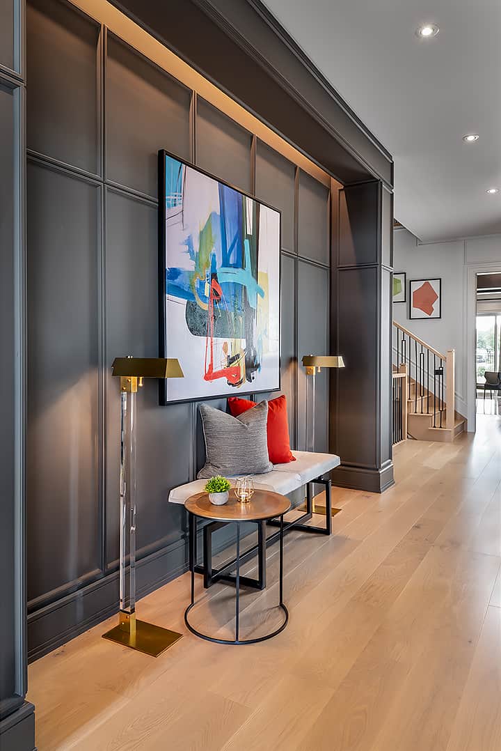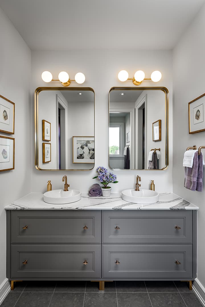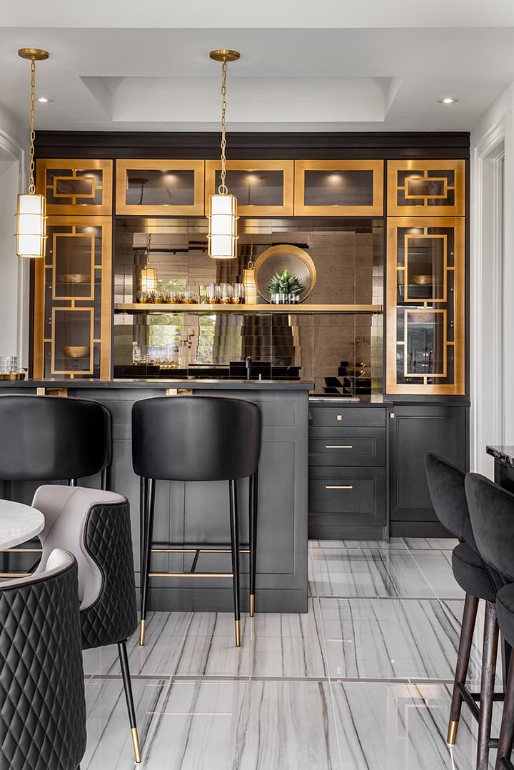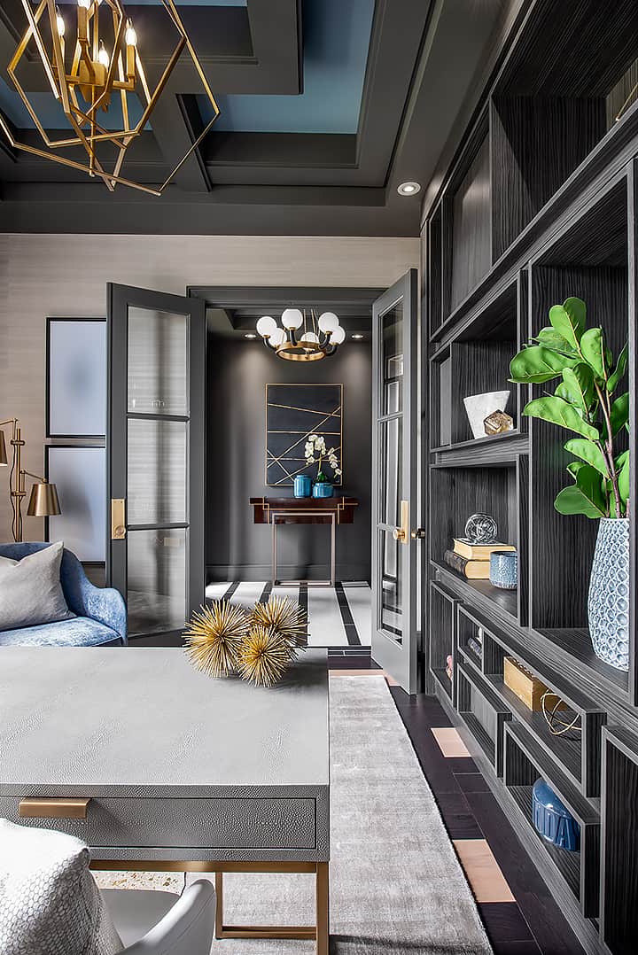 We wanted to create drama and intrigue but still keep the home feeling cozy and easy to live-in. Choosing a palette of smokey greys and gold accents in a variety of textures, sheens and patterns helped us achieve the modern, sophisticated look we were going for.