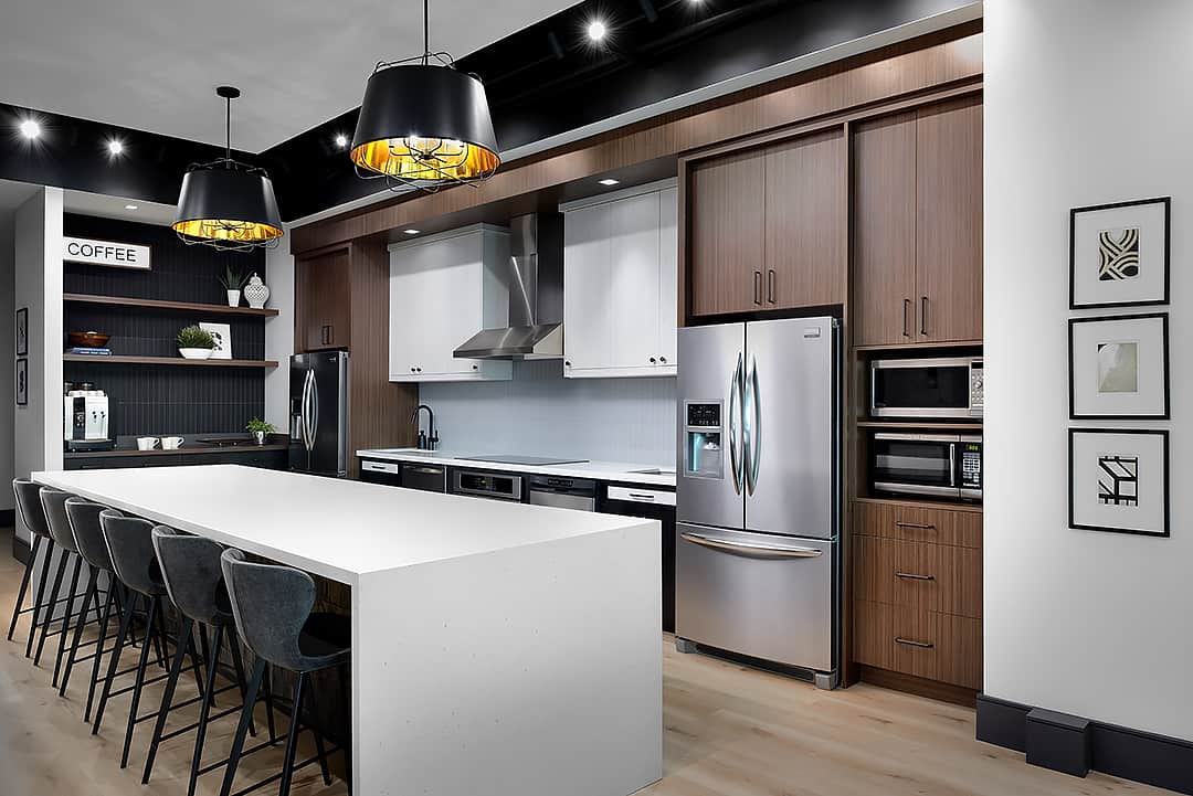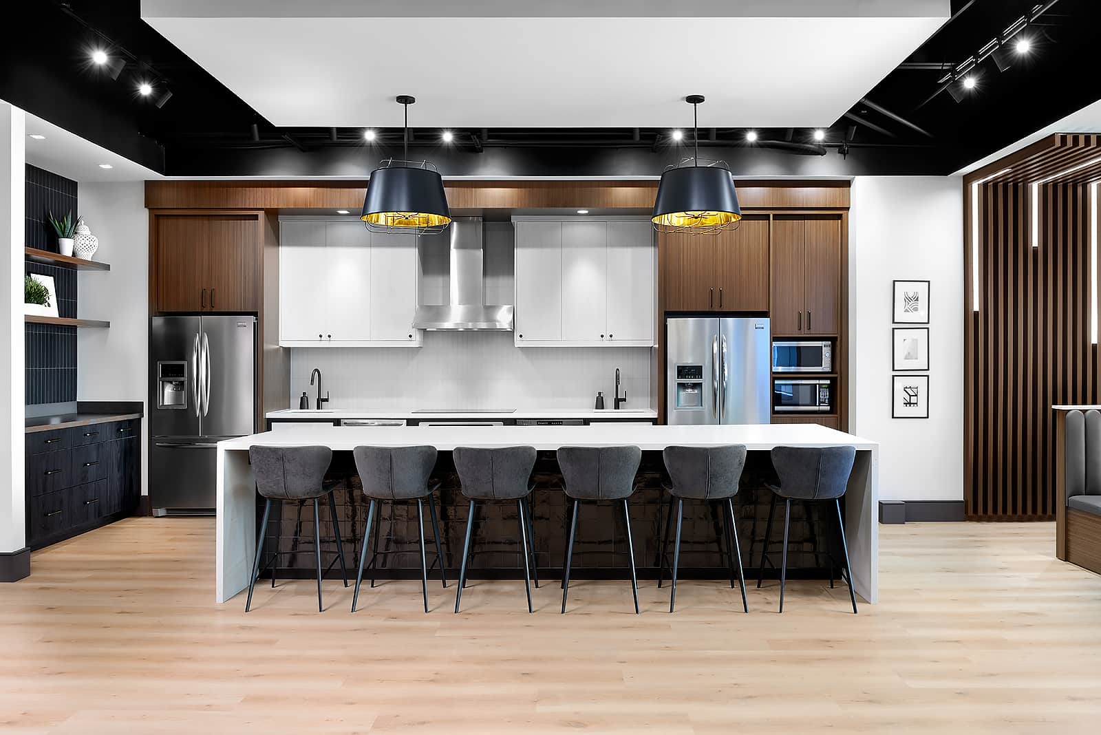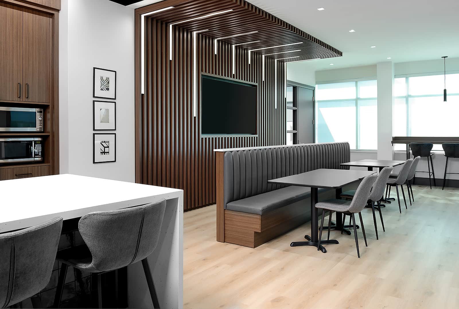 We created a sophisticated staff lounge that balances corporate utility with restorative comfort.