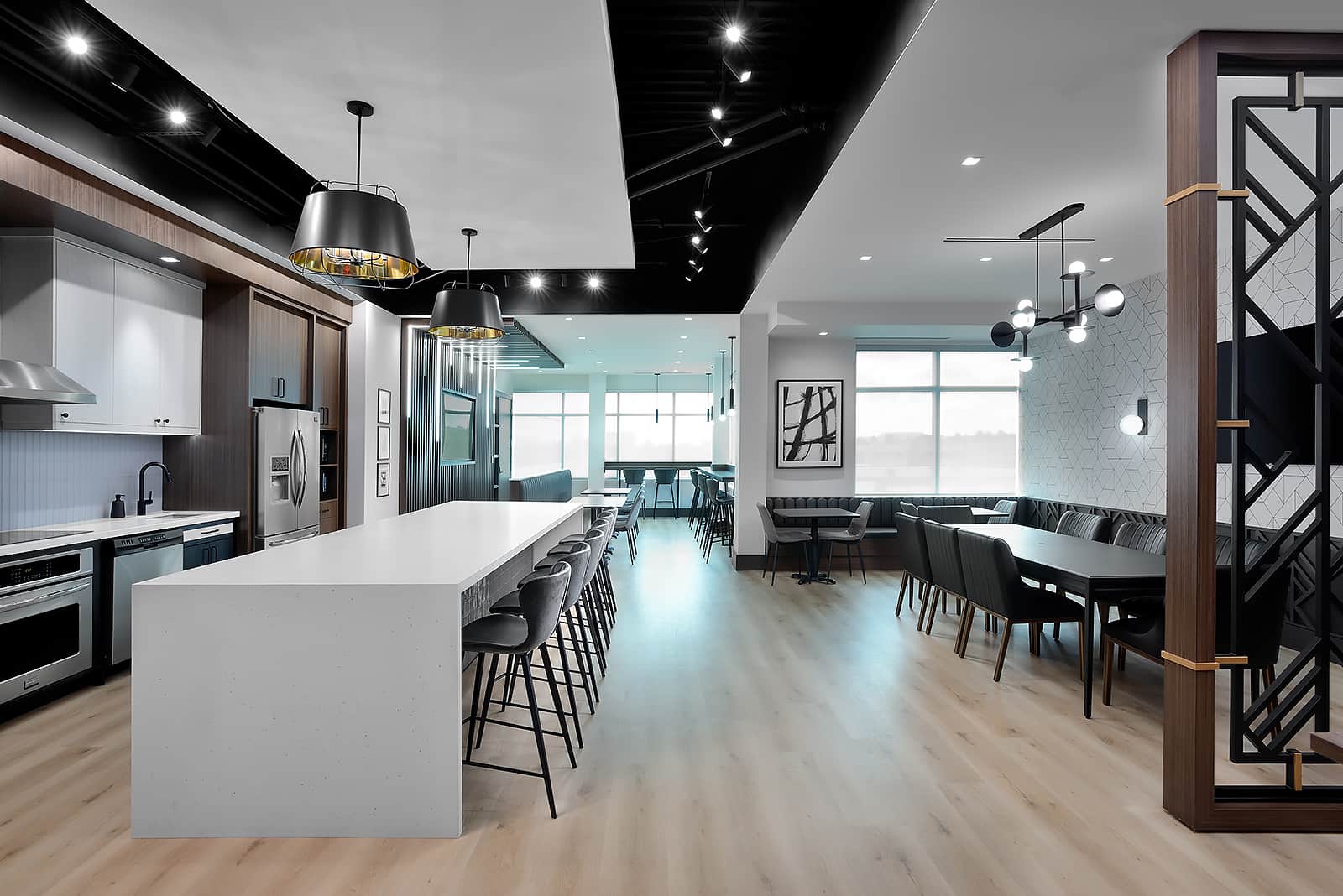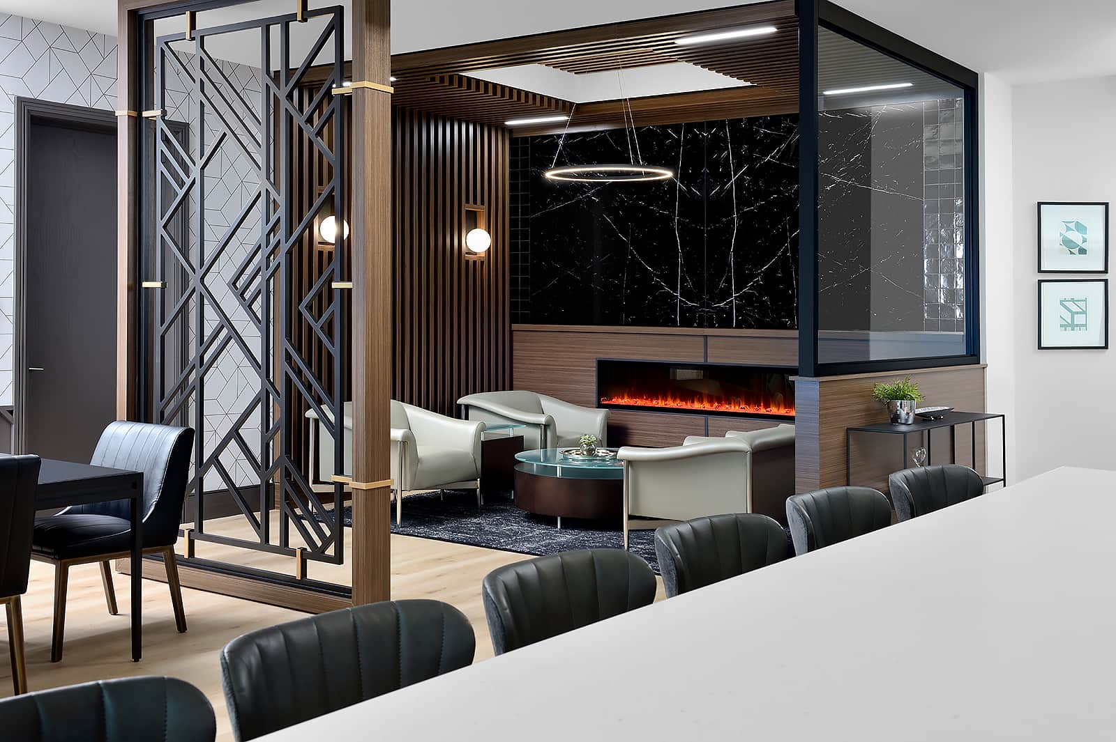 We transformed the open-concept footprint into distinct, functional zones. This strategic layout creates opportunities for both individual respite and collaborative meetings, maximizing the utility of the floor plan while maintaining an inviting atmosphere.