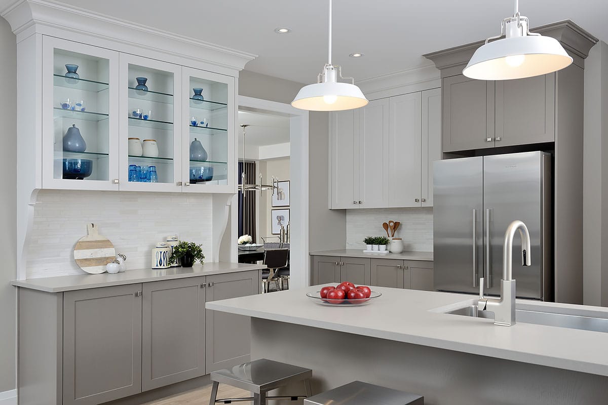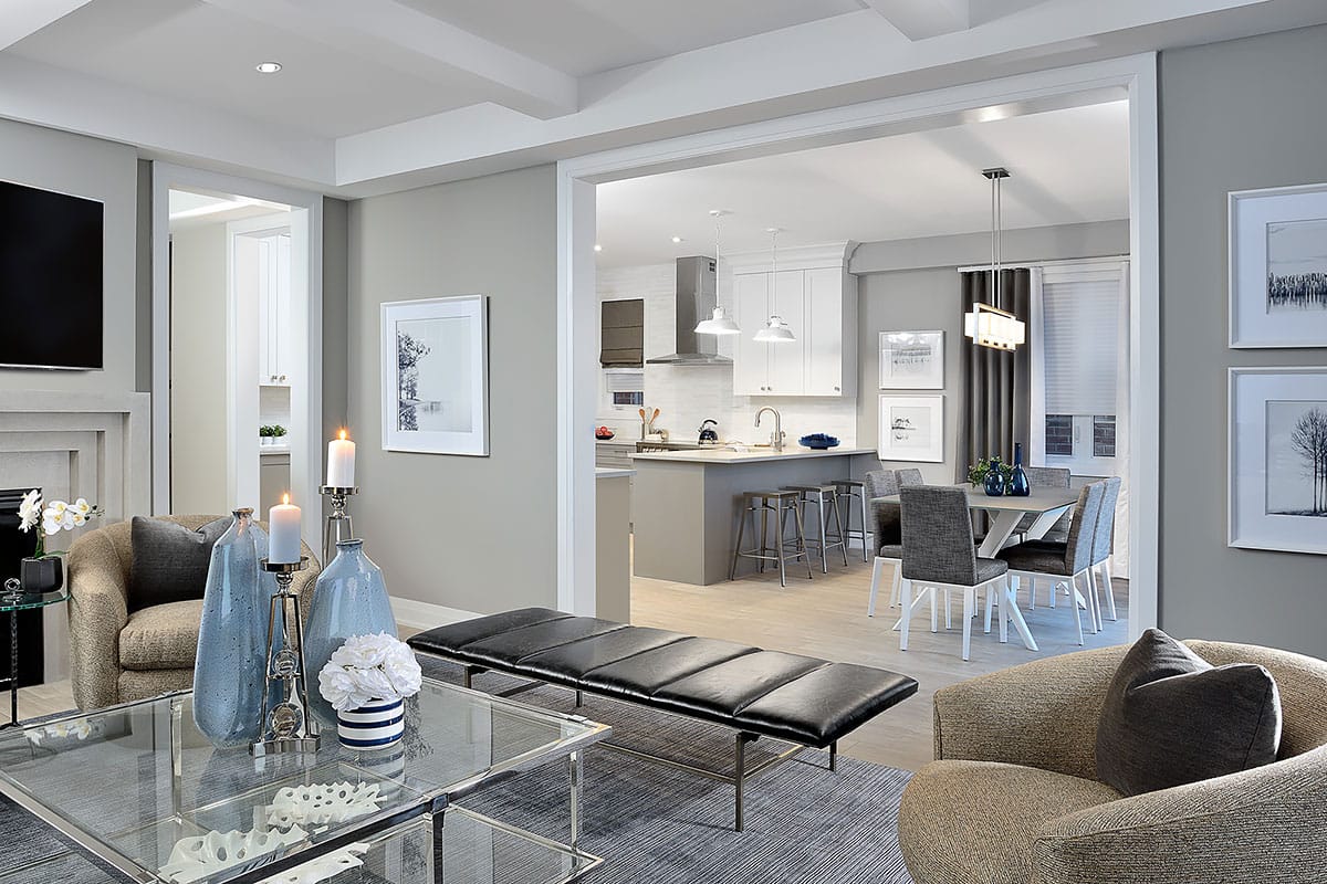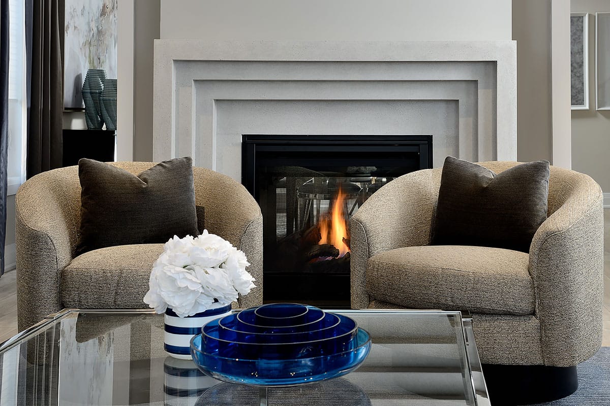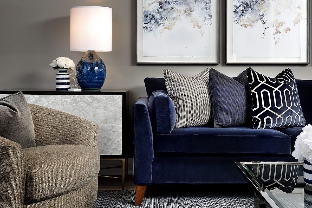 This family home features both modern and classical touches yet reflects a traditional look and feel at its core. Balancing function and style, the rooms connect with a neutral palette, restful on the eye in the dining room and kitchen, the great room adds a surprise pop of luxurious blue that says, “made you look!”.