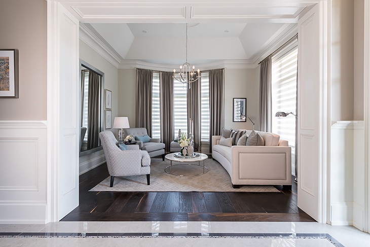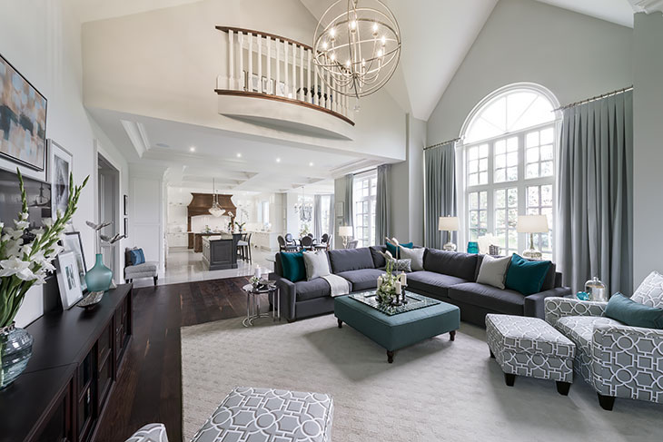 Our vision was to create the front of the house in a more elegant style, while getting more casual as you move towards the rear of the home. This is reflected in the formal dining and living rooms located in the forepart of the house. We created an upscale feeling with the use of glossy surfaces and full drapes. This is further embellished by the use of marbled, mirrored and glass accent pieces.