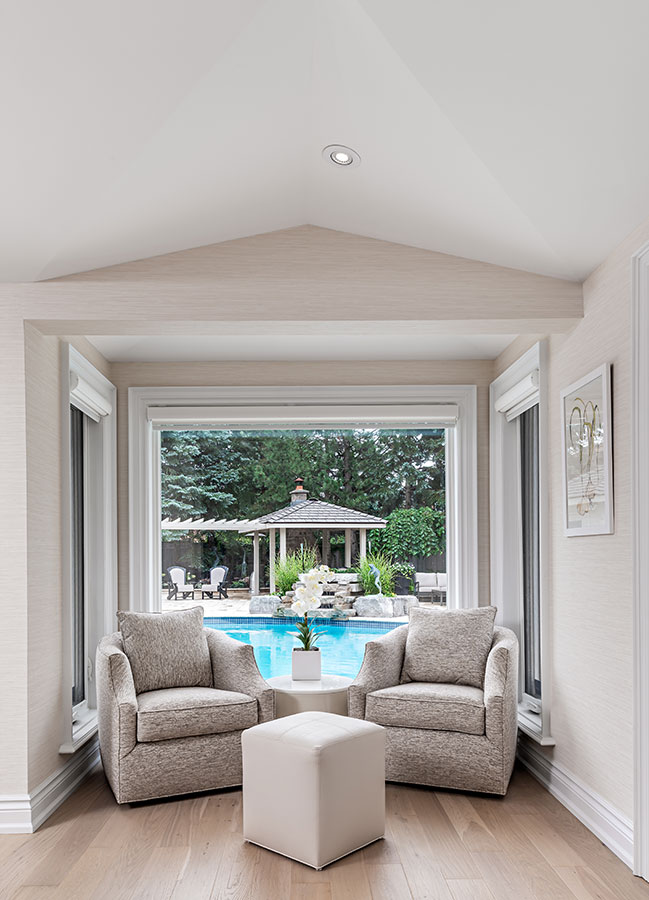 This cozy nook offers as close a view of the pool as you can get, indoors. The original covered deck was renovated to expand the original kitchen without losing any views to the backyard.