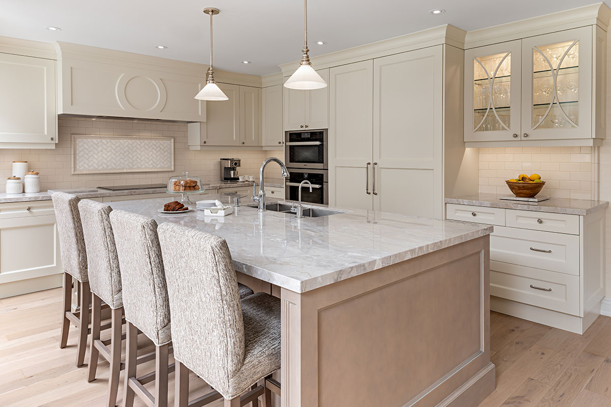 This angle of the kitchen shows off the beautifully designed Downsview Kitchens Cabinetry and range hood.