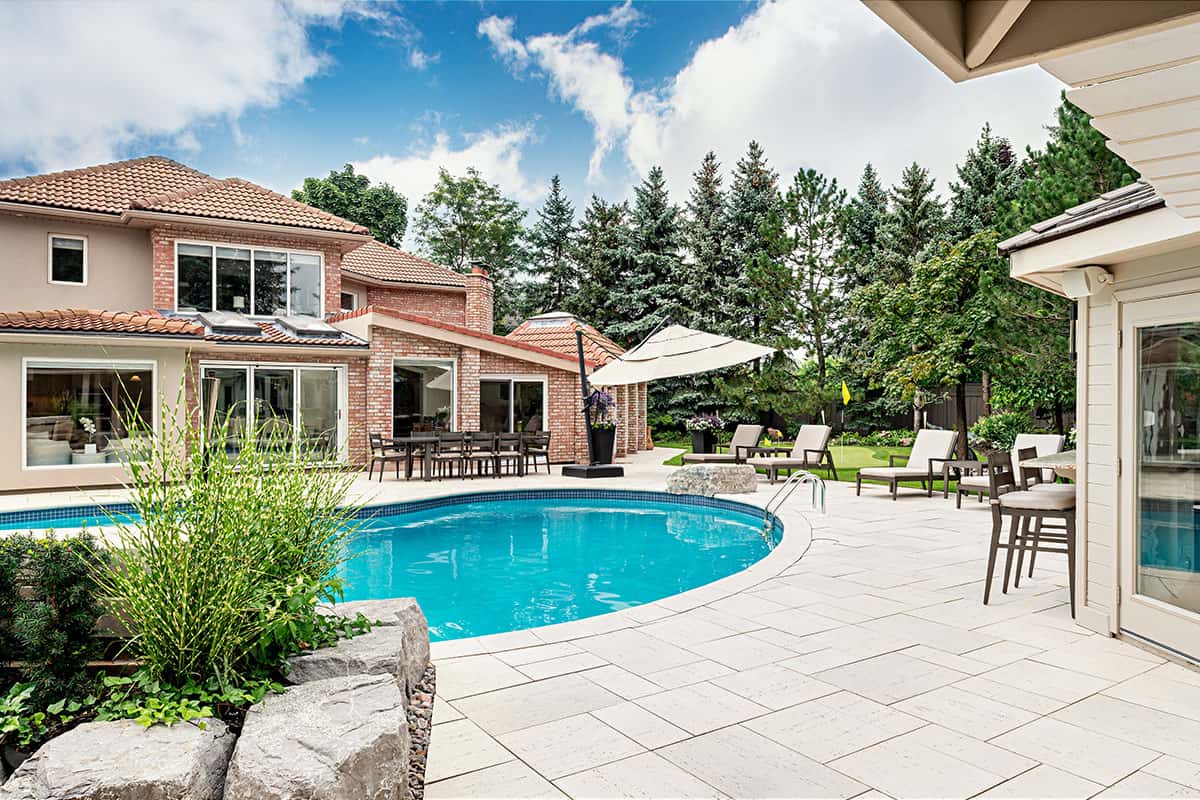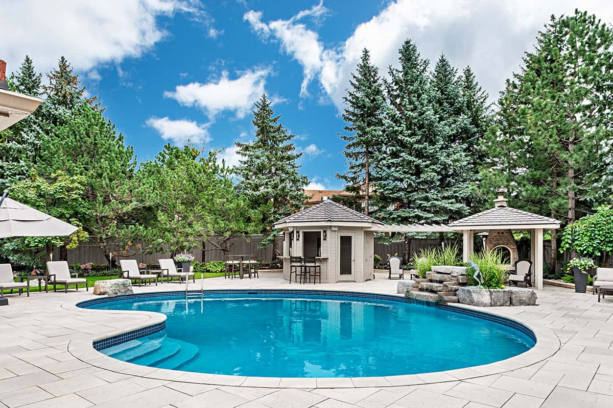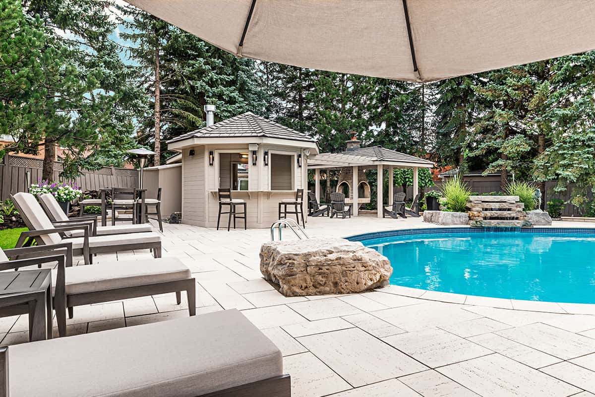 A solid stain coated the original cedar cabana and outdoor fireplace, here it is matched with travertine stone pavers.