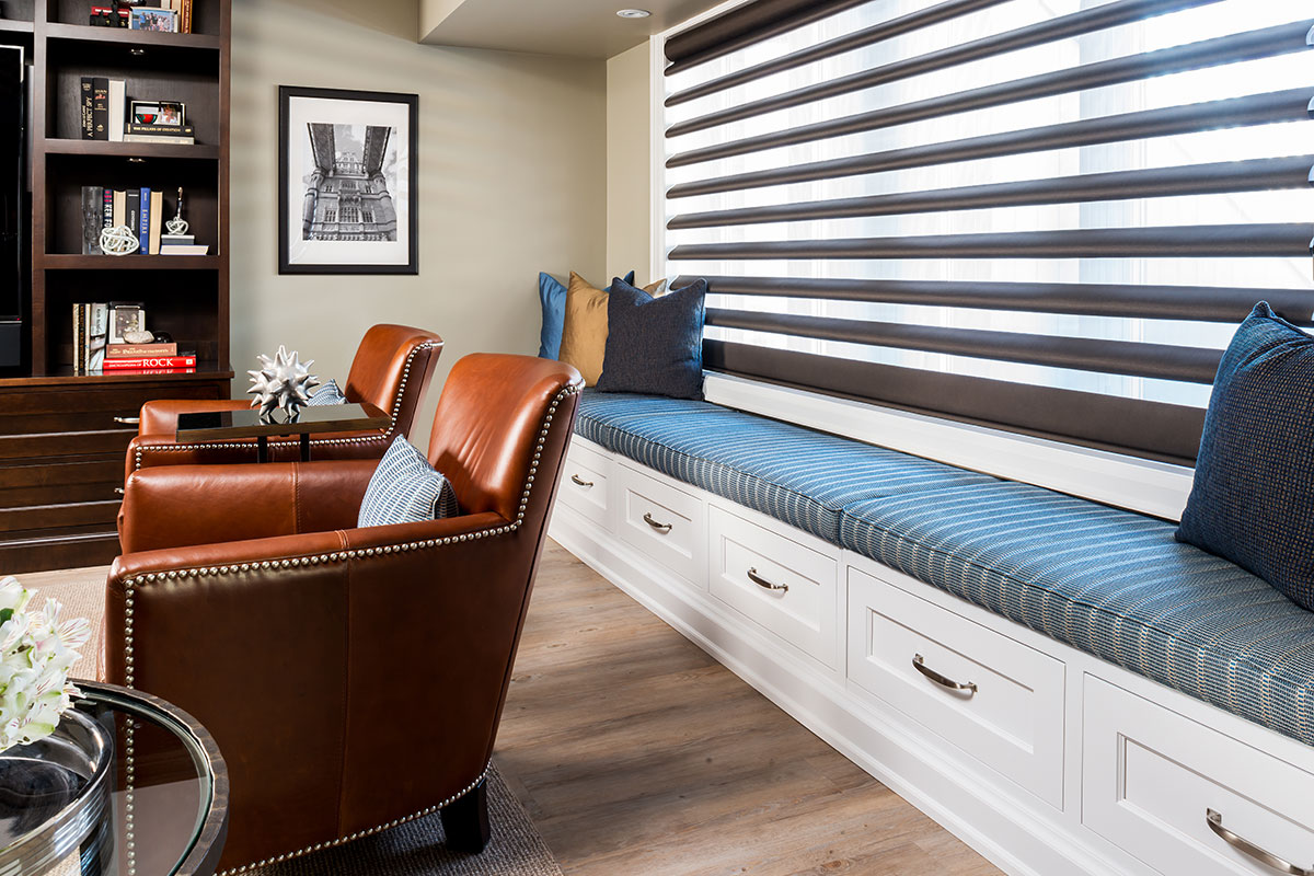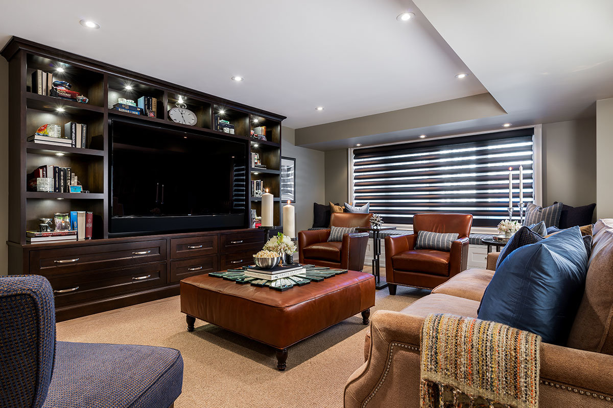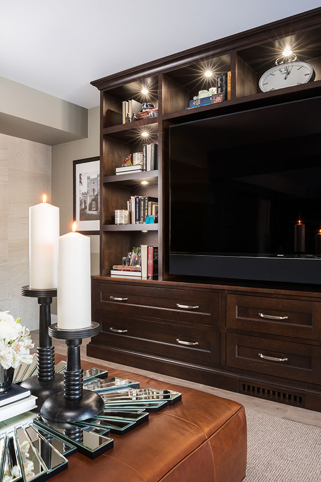 The seating area features the main entertainment cabinetry. This solid Canadian Maple unit was custom-made to feature the large screen TV and still have lots of open shelves for family mementos, kid’s pictures and travel treasures.