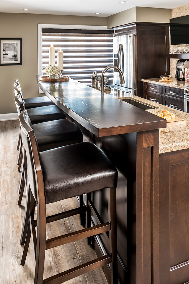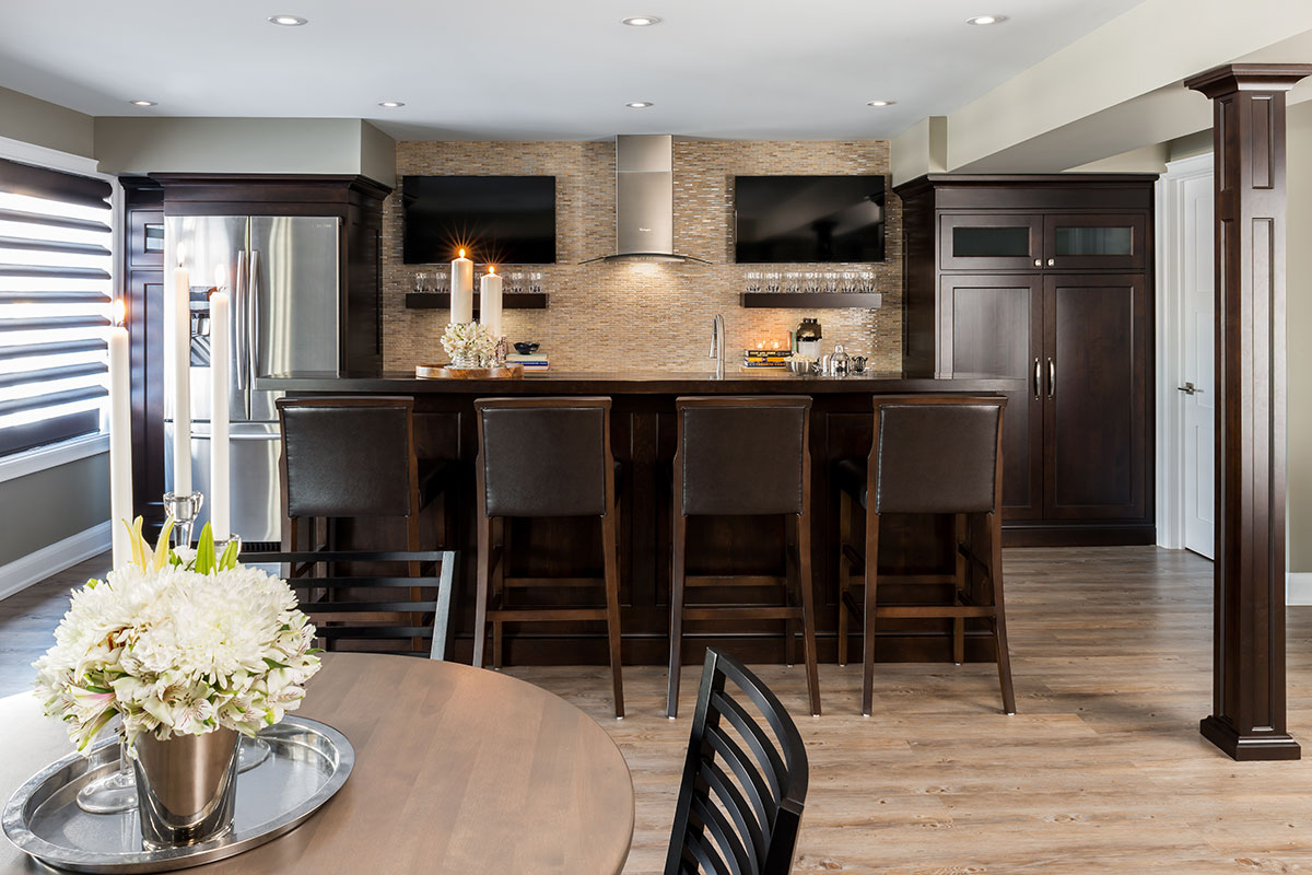 This hard-working couple with three children, love to travel and wanted a place at home to hang out and play with family and friends, just like an English pub. But not the stucco and dark beam look you’d expect, it had to have the essence of a pub but re-interpreted for a contemporary space. Their unfinished, walk-out basement was the perfect place for the transformation.
