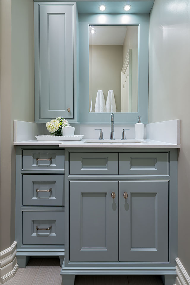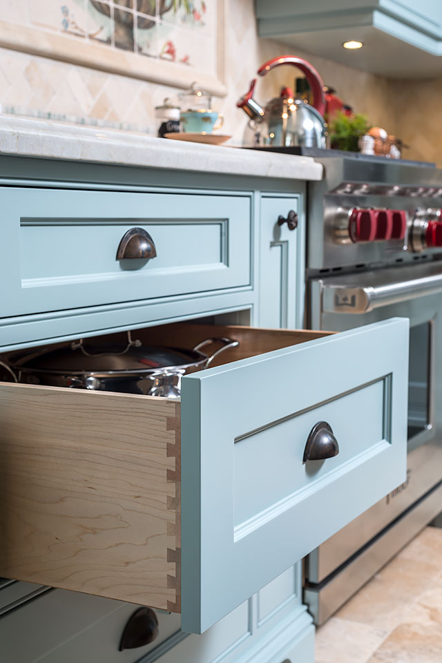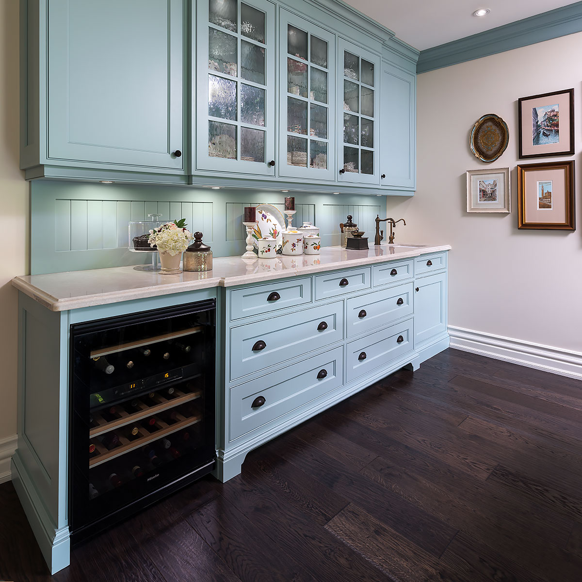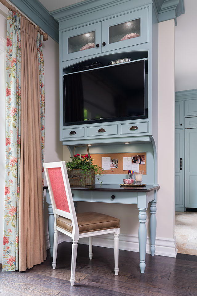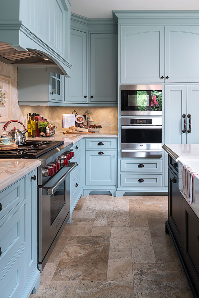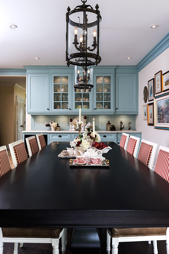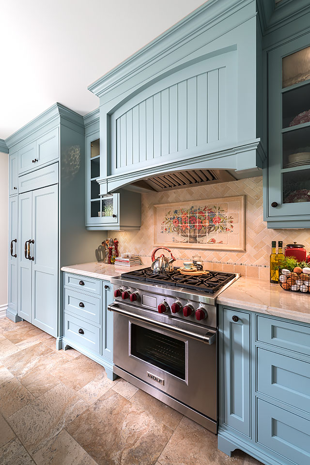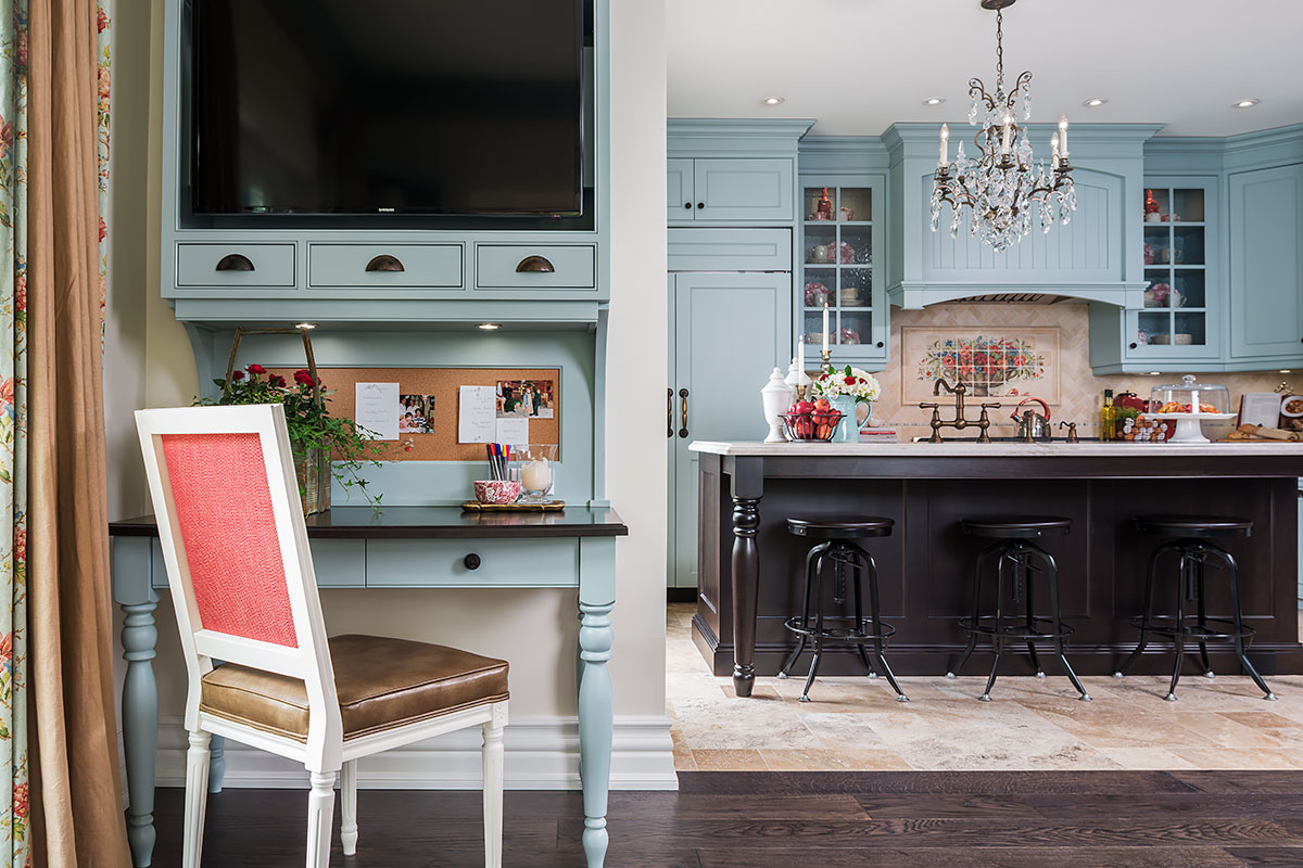 All cabinetry was custom-crafted in Ontario, made from solid Maple. The island in dark stain and soft turquoise on the cabinetry were combined to capture the quality and timelessness of unique, Provence style.