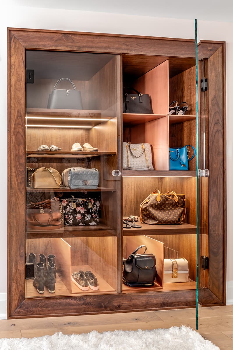 Who wouldn’t love a custom-made purse and shoe closet? Beautiful natural elements like glass, walnut wood and copper add a modern, chic touch.