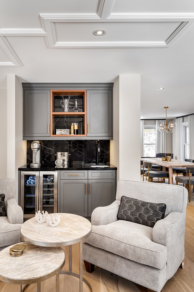 Walls came down to open the back half of the house. A central powder room was relocated and replaced with a wet bar.