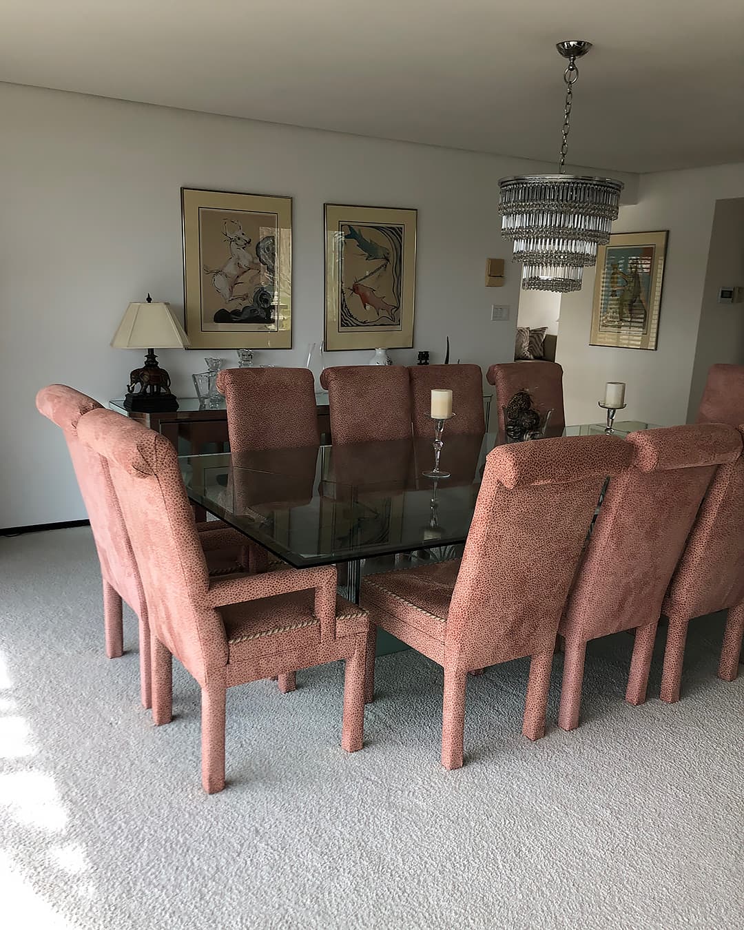 After: Everything except the glass table top was replaced. Now, the dining room pedestal table looks like a sculpted work of art in glass and porcelain-wrapped wood. It perfectly reflects the glass and branch-like chandelier above. Visit Mid-Century Modernized to see the whole home transformation.