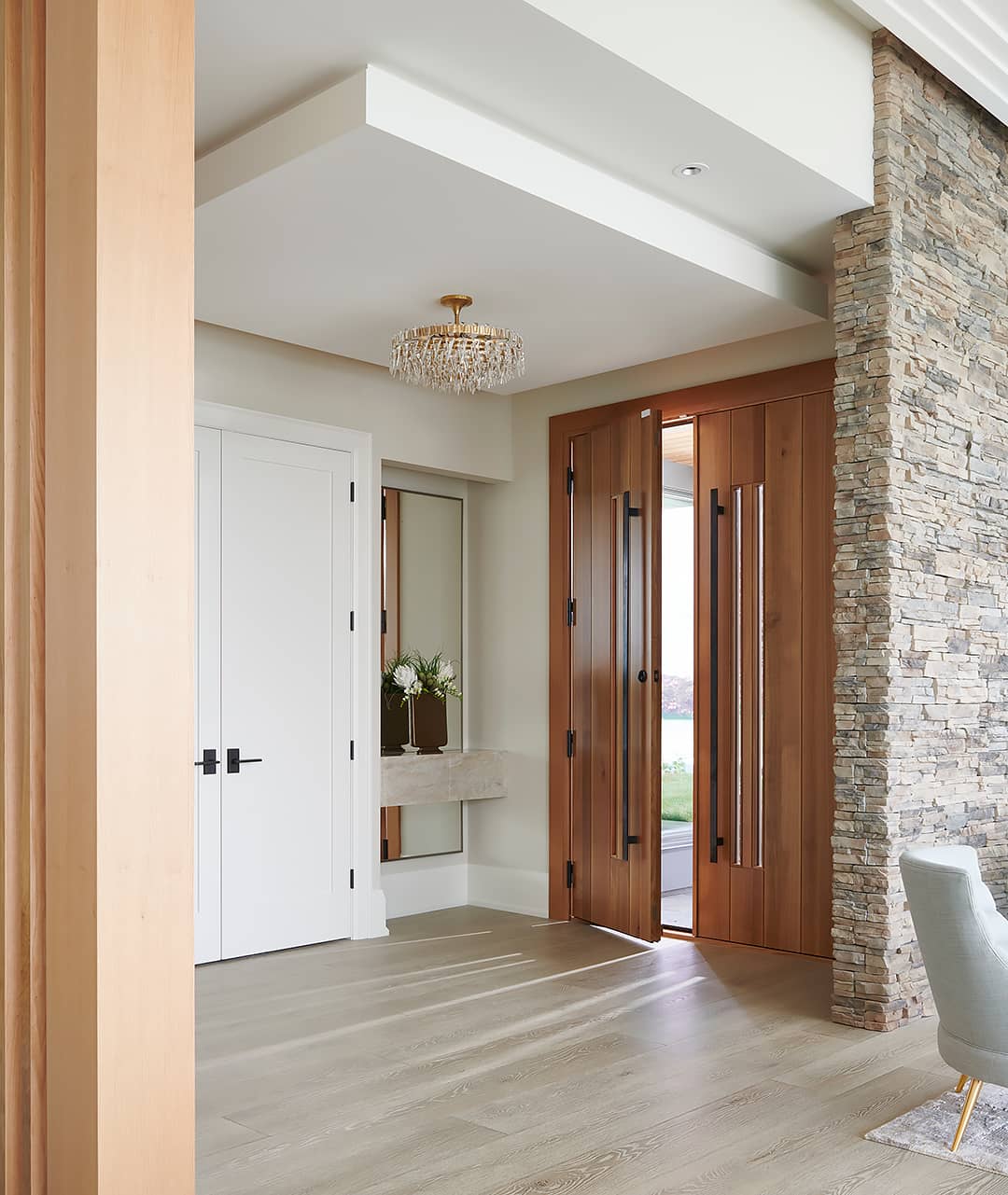 After: Tall, wood double doors with slim, inset glass channels and linear handles make a grand statement. Stacked stone and white, wide-plank, oak floor enhance the welcoming entrance. Visit Mid-Century Modernized to see the whole home transformation.