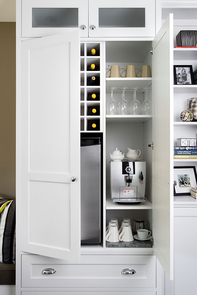 A built-in beverage station with an espresso machine, wine rack and bar fridge fits perfectly behind the custom-made, pantry doors.