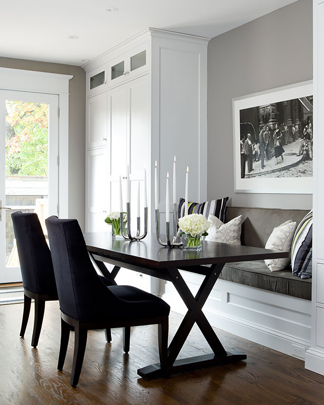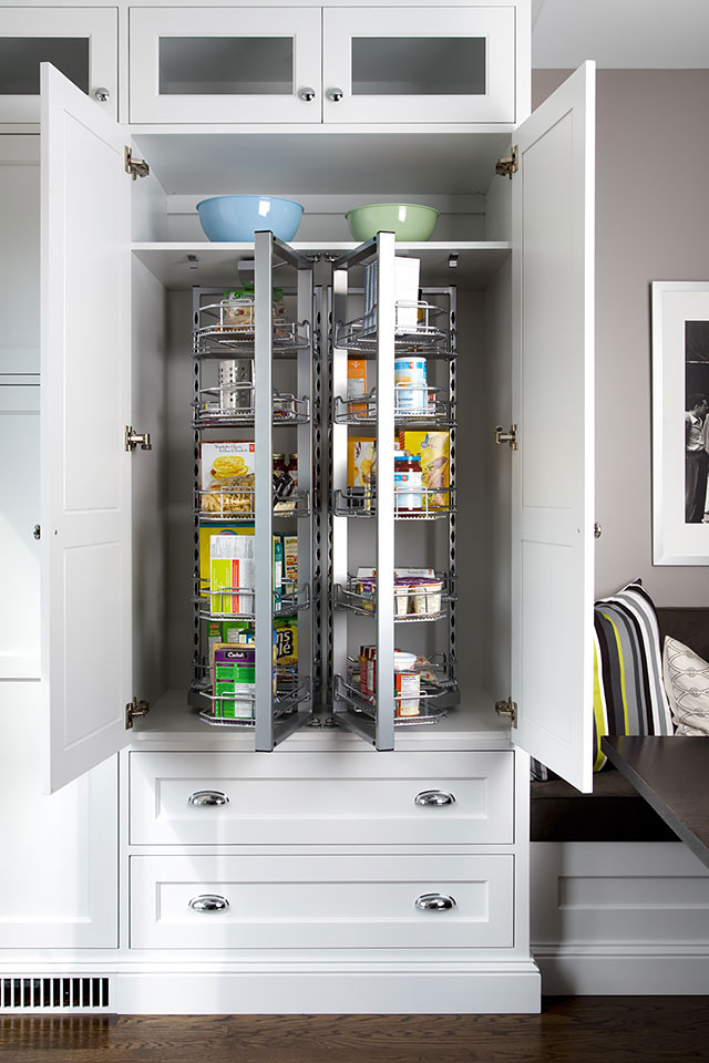 Custom cabinetry flanks both sides of the built-in banquette, this side is outfitted with a metal pantry system.