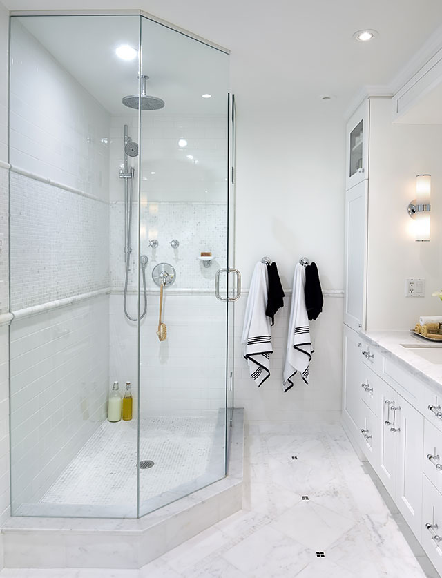 The shower is on show with white subway tile and a mini-tile inset. Glass walls that reach up to the ceiling don’t add any visual weight to the room, keeping it clean and airy.
