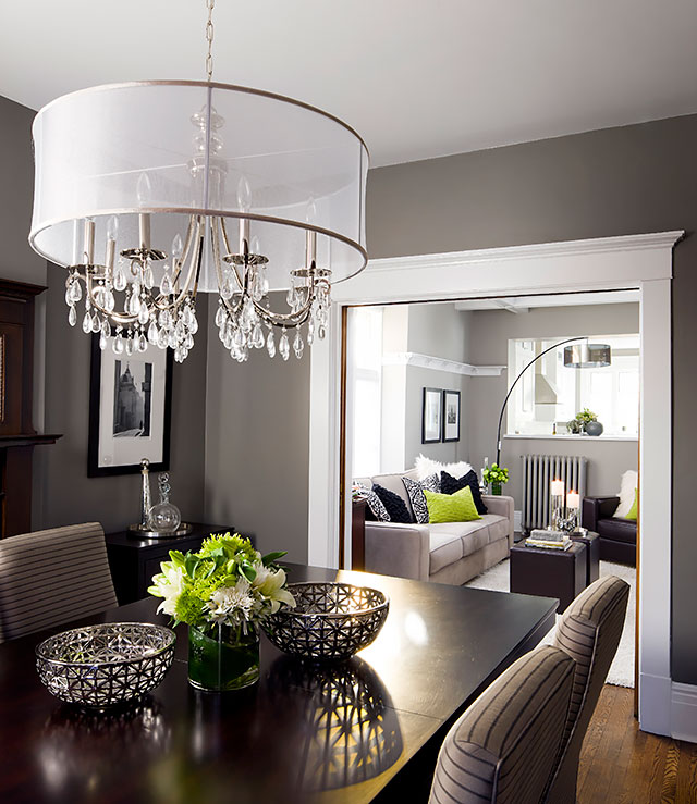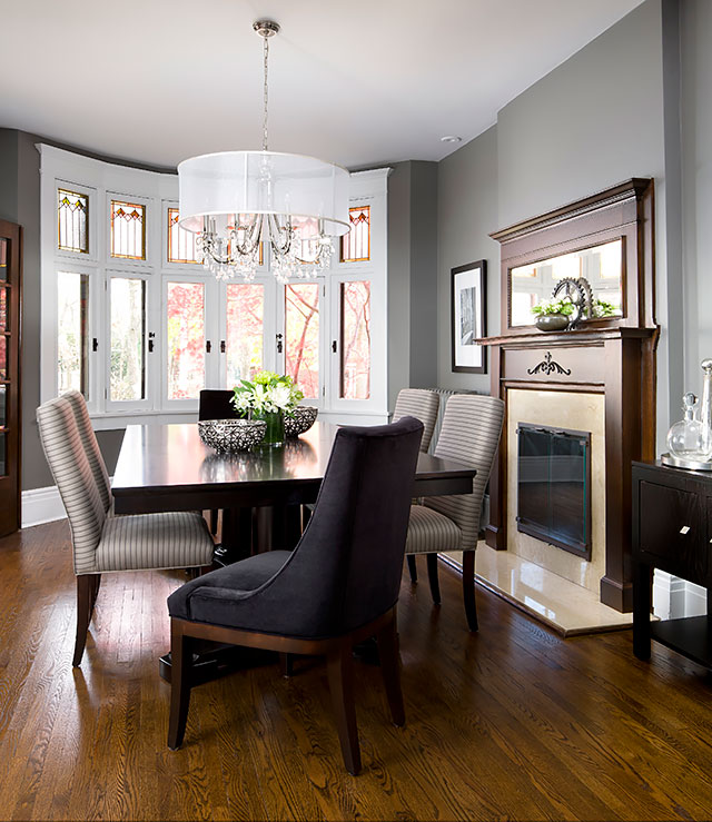 The dining room’s modern furnishings and shaded chandelier are framed beautifully by the classic leaded windows and beautifully refinished fireplace.